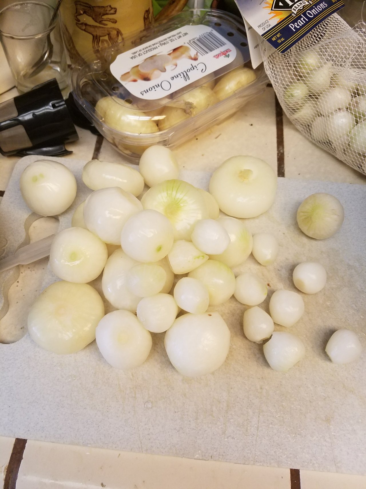 Parboil all of the onions and immediately transfer to a bowl of ice water. Top and tail them and remove the outer skins.