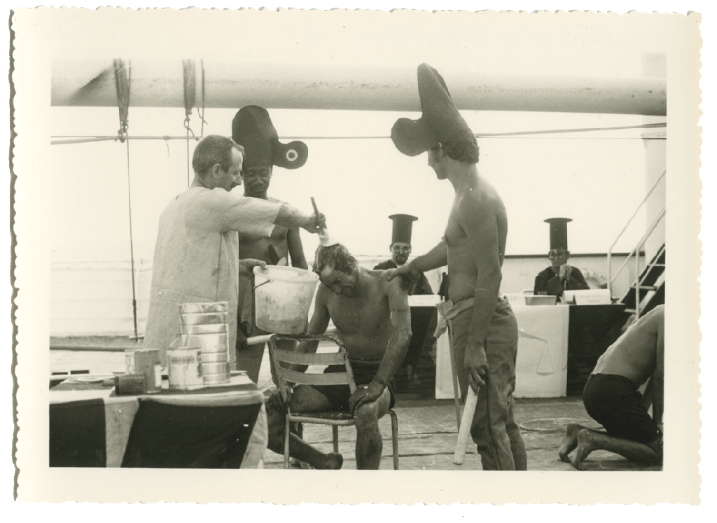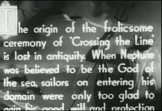 A line crossing ceremony refers to a sort of ritual performed among the crew when a ship crosses a significant ocean line, usually the Equator, though there are specifics for other lines or landmarks as well. These ceremonies are usually performed by navies, merchant navies, and sometimes passenger cruises or sail training ships, as well. The important point is that by crossing a significant line in the ocean, you join a community of other people who also are considered well traveled sailors, called Shellbacks. Those who have not are called Pollywogs.