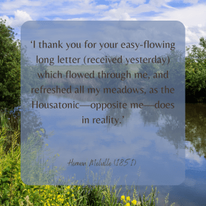 But I promised you letters, so here are a few. Unfortunately, I can only find Melville’s letters to Hawthorne, and none from Hawthorne, from a book called, Divine Magnet, compiled by Mark Niemeyer. However, I have to assume they were equally rapturous, given that Hawthorne is the one who held onto his. Read them to whoever you love.