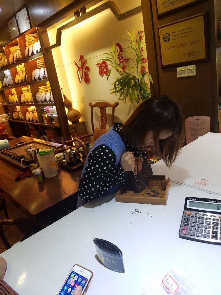 Behold! A pic from the two-story tea mall in Shenzhen! This shopkeeper is cutting chunks off a tea brick for us.